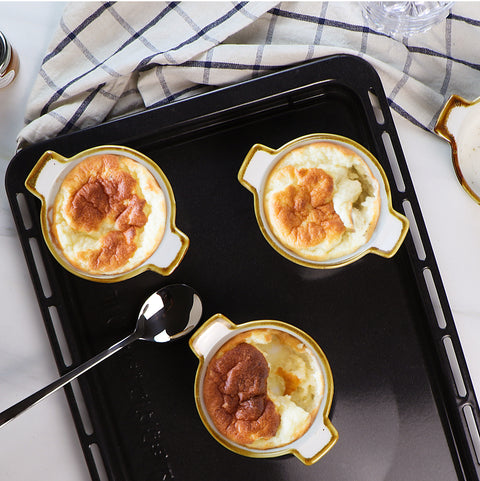 I've ordered a few different sets of ramekins and liked them, but these 6 oz. ramekins from ONEMORE are fantastic! The bottom is stamped with a label that mentioned they are dishwasher, oven, and microwave safe. The lids also work wonderful to hold in heat after baking your goods. The speckled gold/yellow/cream color is rustic, but classic. And the little handles on the sides! They're functional, perfectly sized, and adorable! I'd highly recommend them for the price, don't hesitate to get them!