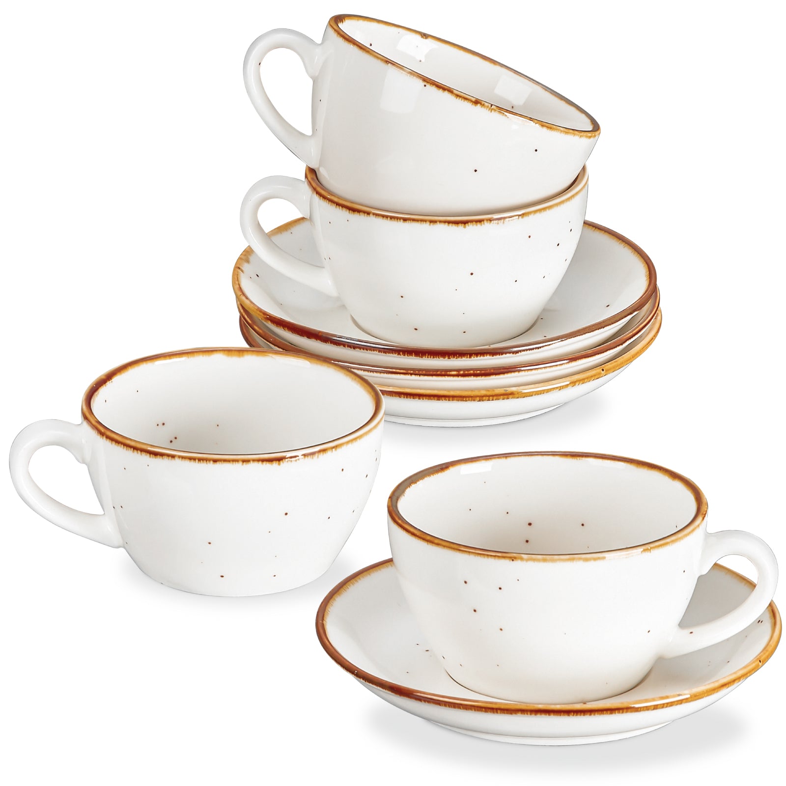 Set of 4 cappuccino cups and saucers has a unique rustic look with a smooth glaze and brown edges that add a little speckle to the surface.Our cappuccino cup set is made of natural clay porcelain, which is lead and cadmium free and will not react with food acids. They're processed...