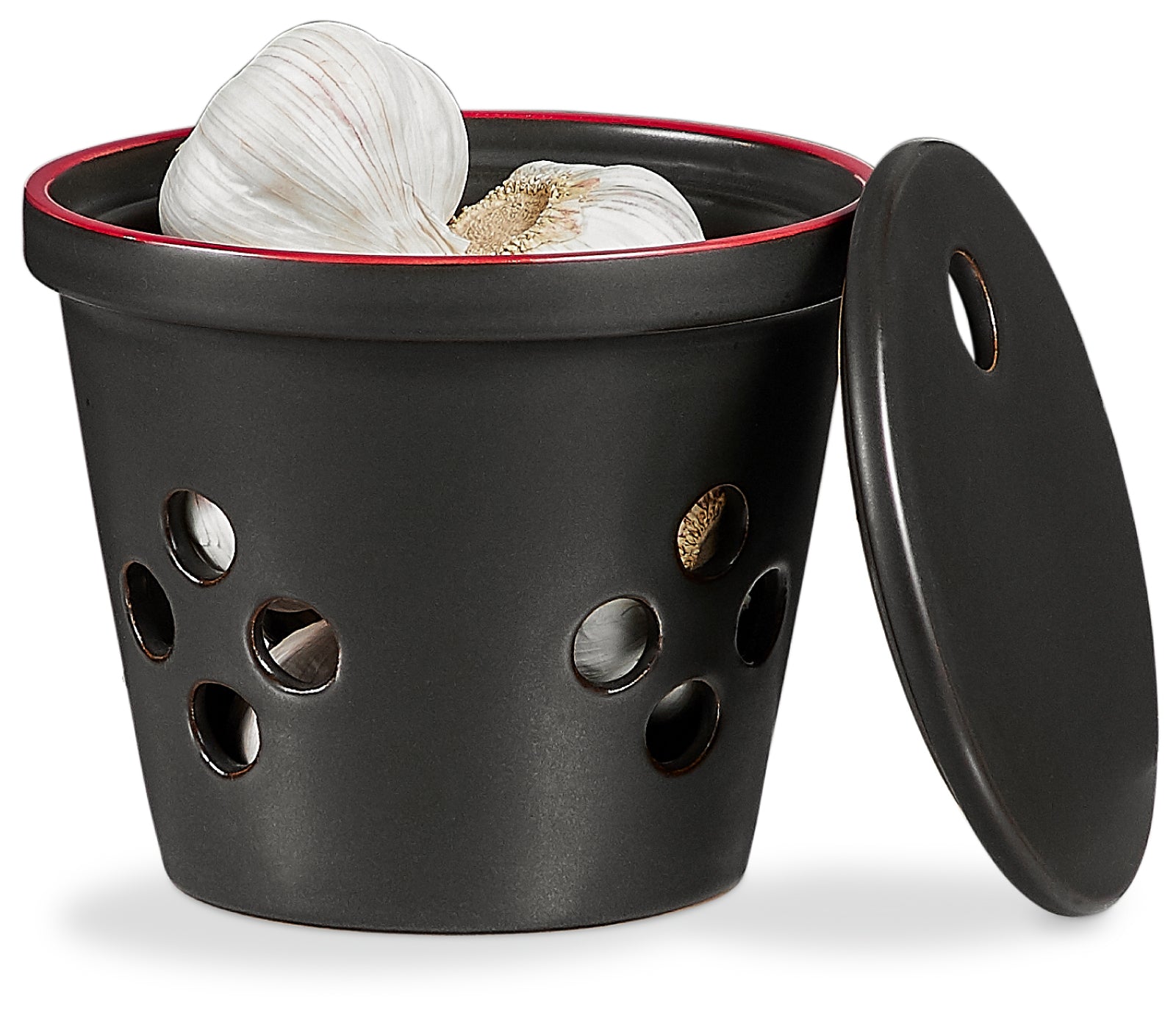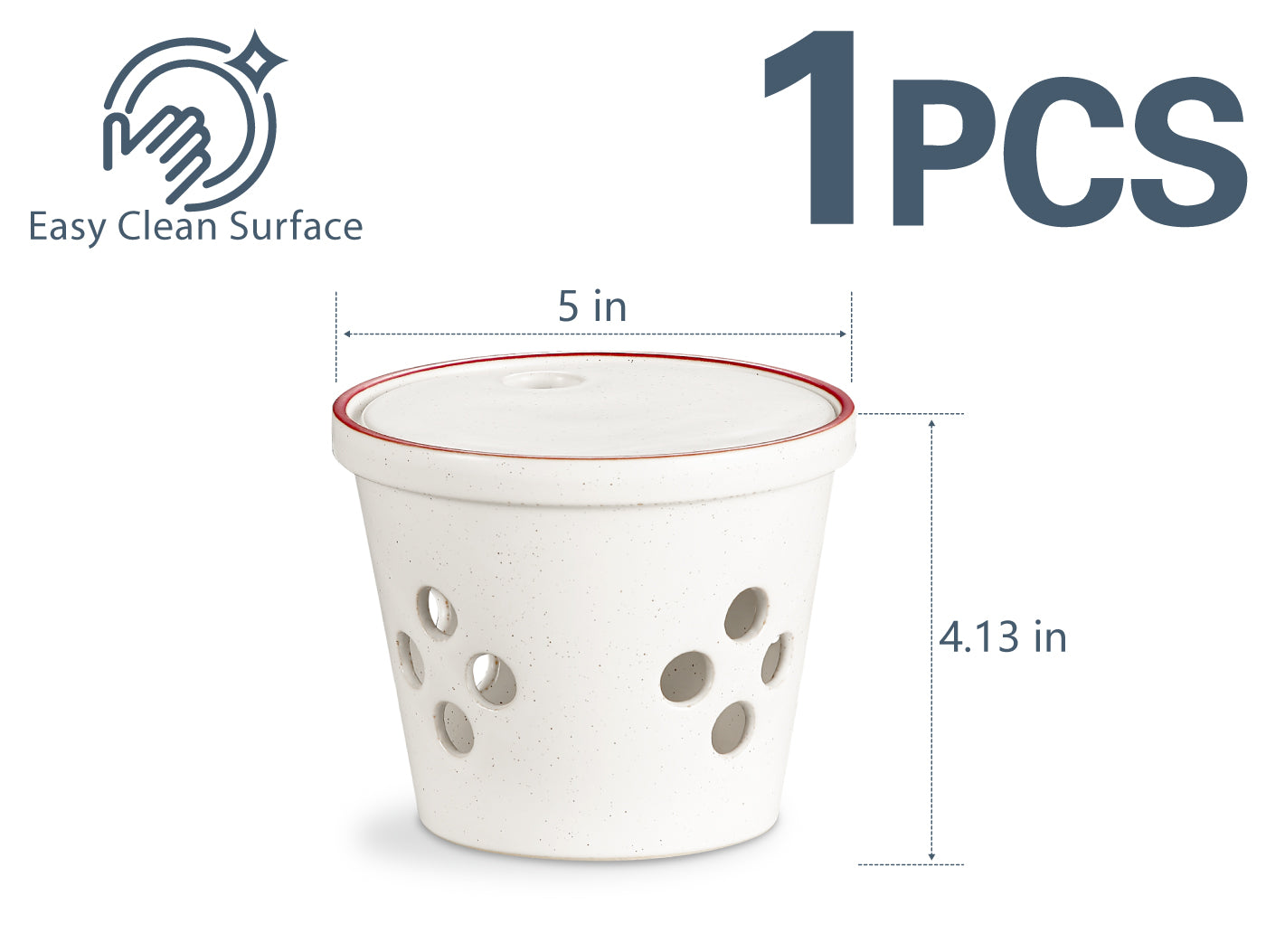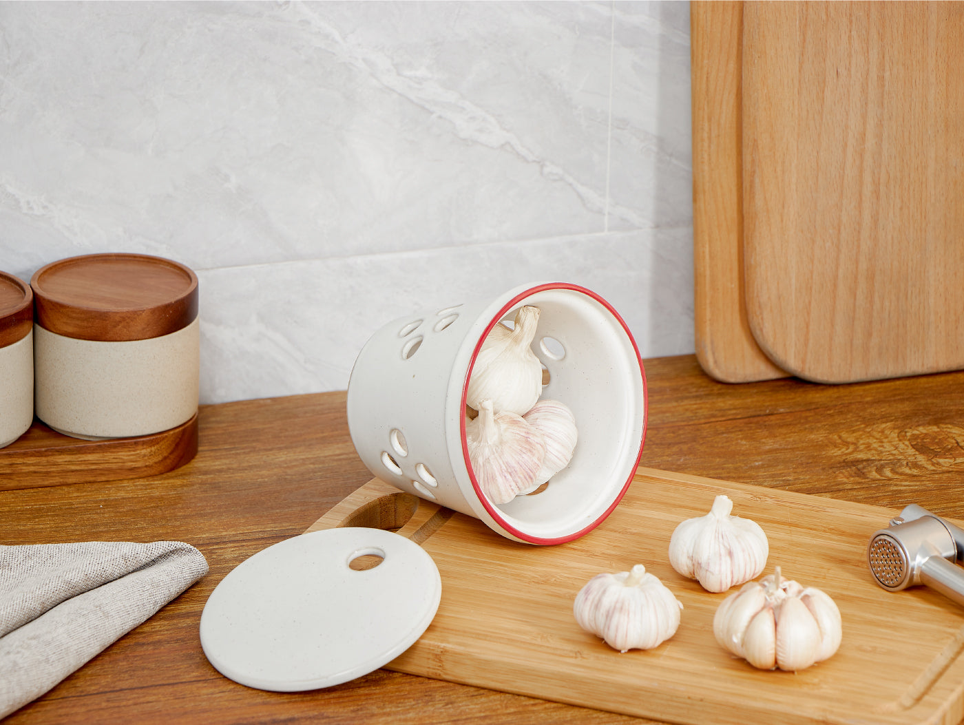The garlic holder measures 5(Dia) x 4.13(H) inches, holding 6 to 8 heads of regular size garlic. Wide opening for easier storing and taking, suitable for garlic, onion, and ginger storage.